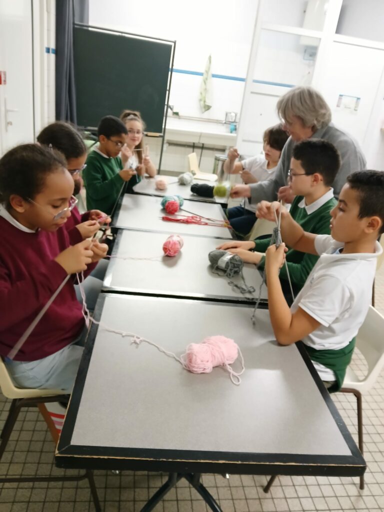 Au fil des séances, les enfants découvrent les bases du tricot : tenir les aiguilles, apprendre quelques points simples, compter, mesurer et surtout travailler ensemble. Ce projet leur permet de développer la patience, la concentration et le plaisir de créer de leurs propres mains.